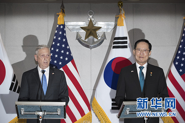 6月28日,在韓國(guó)首爾,韓國(guó)國(guó)防部長(zhǎng)官宋永武(右)與到訪的美國(guó)國(guó)防部長(zhǎng)馬蒂斯出席新聞發(fā)布會(huì)。新華社發(fā)(聯(lián)合采訪團(tuán)供圖)