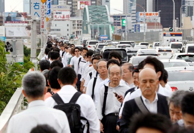 6月18日,在日本大阪,人們?cè)诨疖嚭偷罔F因地震暫停后步行經(jīng)過(guò)一座橋梁。(新華社/美聯(lián))