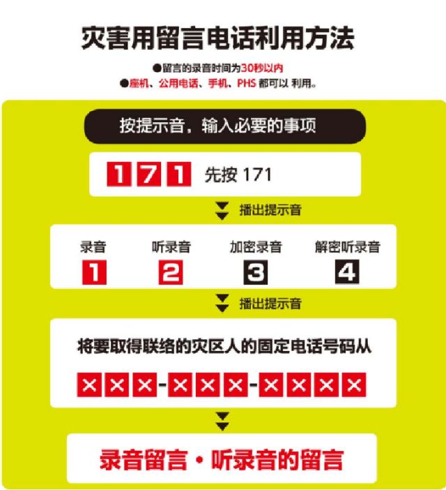 強(qiáng)震往往造成通信中斷。為方便民眾震后互相確認(rèn)平安,日本政府設(shè)置了災(zāi)害用留言電話。若震后通信中斷,可撥打171留言或收聽(tīng)親友留言,英文版介紹請(qǐng)見(jiàn):http://www.ntt-east.co.jp/en/saigai/voice171/index.html