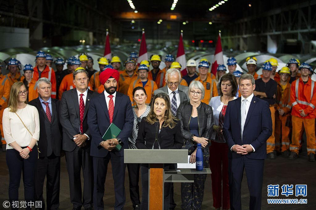 當?shù)貢r間2018年6月29日,加拿大漢密爾頓,加拿大外交部長弗里蘭、經(jīng)濟發(fā)展部長貝恩斯和勞工部長哈伊杜造訪斯特爾科鋼鐵公司,并共同宣布從7月1日起,加拿大將對約126億美元從美國進口的商品加征關(guān)稅,以報復(fù)特朗普政府對加拿大鋼鋁產(chǎn)品加征關(guān)稅。他們還表示,加拿大政府將向本國鋼鋁產(chǎn)業(yè)和制造業(yè)提供約15億美元財政援助。(圖片來源:視覺中國)