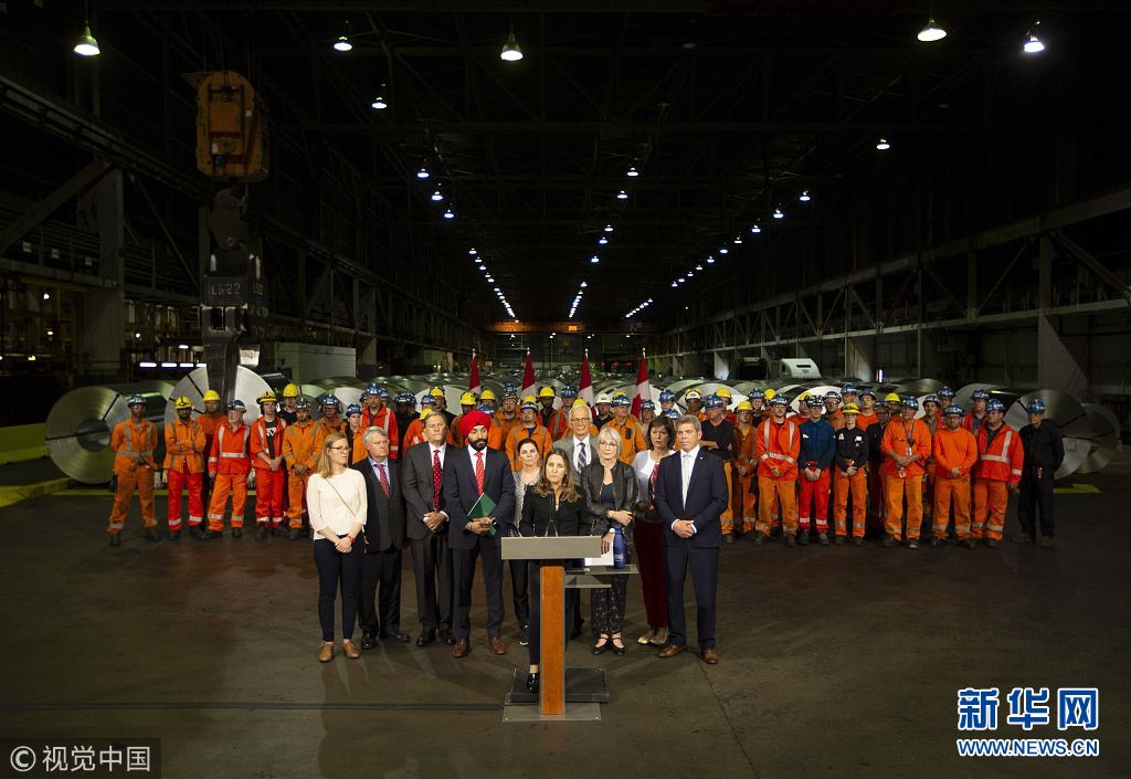 當(dāng)?shù)貢r(shí)間2018年6月29日,加拿大漢密爾頓,加拿大外交部長(zhǎng)弗里蘭、經(jīng)濟(jì)發(fā)展部長(zhǎng)貝恩斯和勞工部長(zhǎng)哈伊杜造訪斯特爾科鋼鐵公司,并共同宣布從7月1日起,加拿大將對(duì)約126億美元從美國(guó)進(jìn)口的商品加征關(guān)稅,以報(bào)復(fù)特朗普政府對(duì)加拿大鋼鋁產(chǎn)品加征關(guān)稅。他們還表示,加拿大政府將向本國(guó)鋼鋁產(chǎn)業(yè)和制造業(yè)提供約15億美元財(cái)政援助。(圖片來源:視覺中國(guó))