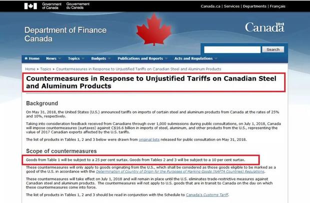 加拿大財政部官網(wǎng)發(fā)布的公告,標題可以說是相當?shù)刂笔阈匾芰耍骸秾幽么箐撲X產(chǎn)品受到不公平關稅待遇的反擊措施》(Countermeasures in Response to Unjustified Tariffs on Canadian Steel and Aluminum Products)。抱怨三連:countermeasures(對抗措施), in Response to(對……做出反應),unjustified(不公平的)——看得出,加拿大是真生氣了。