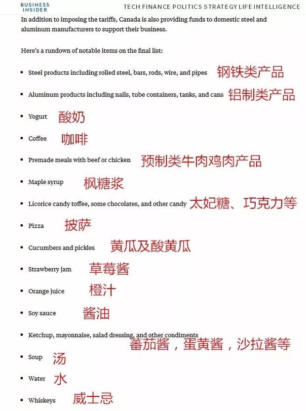 美國網(wǎng)站Business Insider貼心做了個大致梳理,不難看出,這份后續(xù)打擊清單,正如加拿大廣播公司評論所說,乍看上去簡直像是家庭主婦去超市的購物單:從比薩餅到草莓醬,從威士忌到酸黃瓜,跟第一輪打擊的鋼鋁顯得實在不匹配。