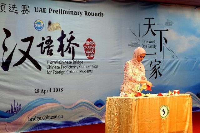 2018年4月28日, 第17屆“漢語橋”世界大學(xué)生中文比賽阿聯(lián)酋賽區(qū)預(yù)選賽上,扎耶德大學(xué)18歲的大一女生獲得冠軍。新華社記者 蘇小坡攝