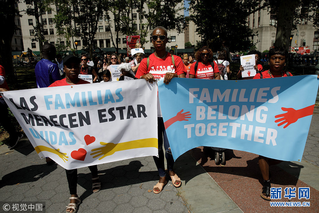 當(dāng)?shù)貢r(shí)間2018年7月18日,美國紐約,包括托兒所從業(yè)人員、父母及其子女在內(nèi)的社會(huì)各界人士在美國移民和海關(guān)執(zhí)法局(ICE)附近組織示威游行,抗議特朗普政府近期在美國南部邊境實(shí)施針對非法移民家庭的強(qiáng)制拘留和家庭成員離散政策。 當(dāng)天,共和黨領(lǐng)導(dǎo)的眾議院通過了支持ICE的決議,并譴責(zé)一些民主黨人和進(jìn)步積極分子要求廢除ICE的呼聲。(圖片來源:視覺中國)