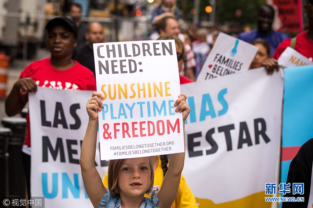 當?shù)貢r間2018年7月18日,美國紐約,包括托兒所從業(yè)人員、父母及其子女在內(nèi)的社會各界人士在美國移民和海關(guān)執(zhí)法局(ICE)附近組織示威游行,抗議特朗普政府近期在美國南部邊境實施針對非法移民家庭的強制拘留和家庭成員離散政策。 當天,共和黨領(lǐng)導(dǎo)的眾議院通過了支持ICE的決議,并譴責(zé)一些民主黨人和進步積極分子要求廢除ICE的呼聲。(圖片來源:視覺中國)