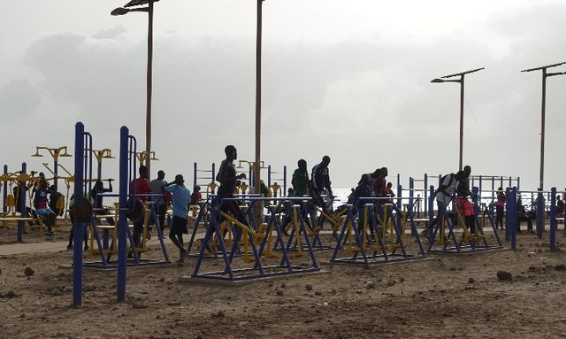 2018年7月18日,塞內加爾首都達喀爾,當?shù)孛癖娫跒I海大道健身公園內鍛煉。(新華社記者賴向東攝)