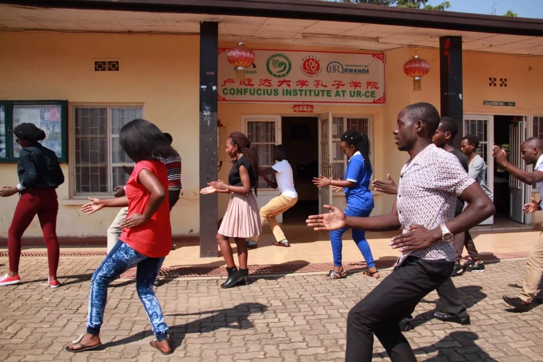 來到盧旺達(dá)大學(xué)孔子學(xué)院,正趕上老師們帶領(lǐng)參加暑期班的同學(xué)們?cè)诓賵?chǎng)上打太極拳。一招一式,頗有章法。