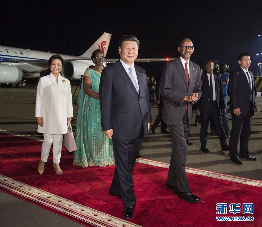 當(dāng)?shù)貢r(shí)間晚8時(shí)50分許,習(xí)近平乘坐的專機(jī)抵達(dá)基加利國(guó)際機(jī)場(chǎng)。習(xí)近平和夫人彭麗媛步出艙門,受到盧旺達(dá)總統(tǒng)卡加梅和夫人珍妮特等熱情迎接。盛裝的禮兵精神抖擻,向尊貴的客人行注目禮。盧旺達(dá)少年向習(xí)近平和彭麗媛獻(xiàn)花??用废蛄?xí)近平和彭麗媛介紹盧方其他迎接人員。身著靚麗民族服裝的當(dāng)?shù)孛癖娞饸g快的迎賓舞,敲響喜慶的非洲鼓,熱烈歡迎中國(guó)貴賓到來(lái)。