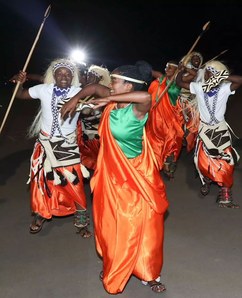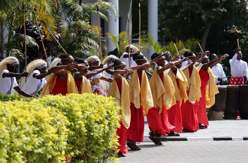 盛裝禮兵英姿挺拔,向尊貴的客人行注目禮。鼓聲響起,盧旺達(dá)民眾身著靚麗民族服裝,跳起熱情的迎賓舞,時(shí)而舒展柔緩,時(shí)而剛健有力。兩國元首駐足觀看,揮手致意。