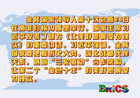 金磚國家領(lǐng)導(dǎo)人第十次會晤26日在南非約翰內(nèi)斯堡舉行。國家主席習近平發(fā)表了題為《讓美好愿景變?yōu)楝F(xiàn)實》的重要講話。習近平強調(diào),金磚國家要把握歷史大勢,深化戰(zhàn)略伙伴關(guān)系,鞏固“三輪驅(qū)動”合作架構(gòu),讓第二個“金色十年”的美好愿景變?yōu)楝F(xiàn)實。?