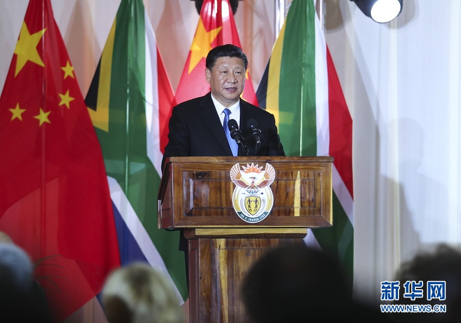 7月24日,國家主席習(xí)近平在比勒陀利亞出席南非總統(tǒng)拉馬福薩舉行的歡迎習(xí)近平主席對南非進(jìn)行國事訪問暨慶祝中南建交20周年晚宴。這是習(xí)近平發(fā)表致辭?!⌒氯A社記者 謝環(huán)馳 攝