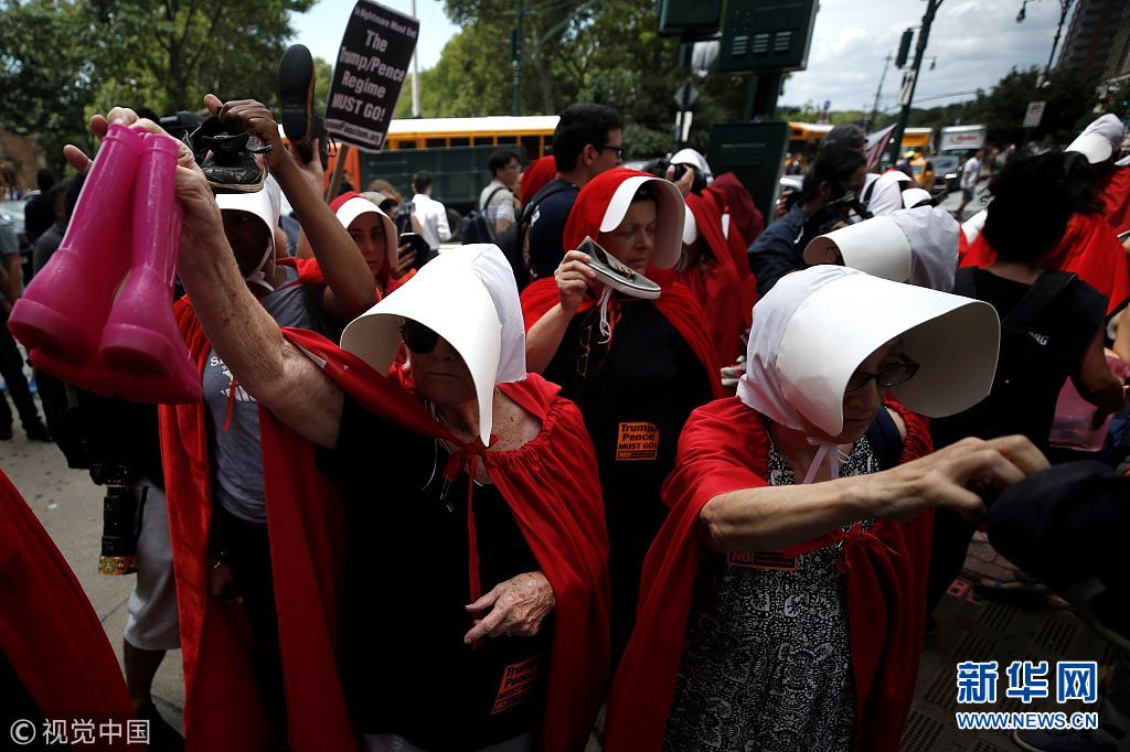 當(dāng)?shù)貢r(shí)間2018年7月31日,美國(guó)紐約,女性示威者扮成美劇《使女的故事》中的“使女”在亞歷山大·漢密爾頓海關(guān)大樓前示威,抗議美國(guó)總統(tǒng)特朗普和副總統(tǒng)麥克·彭斯。她們手持鞋子,代表被迫與父母分離的移民兒童。(圖片來(lái)源:視覺(jué)中國(guó))