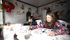 圍繞著中央舞臺,剪紙、書法、針灸等展位前人頭攢動,吸引了許多聞訊而來的華僑華人和當(dāng)?shù)孛癖?。巴西瓦加斯基金會華人教授夏華聲帶著兩個兒子前來參加活動。