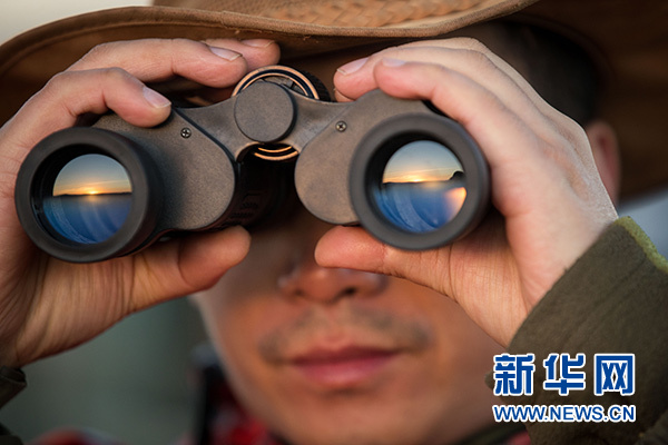 7月7日,在肯尼亞馬賽馬拉大草原奧肯耶保護區(qū),卓強用望遠鏡觀察保護區(qū)情況。新華社記者 呂帥 攝