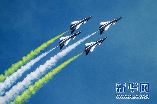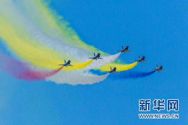 蔚藍(lán)的天空下,八一飛行表演隊(duì)成功上演了六機(jī)向下開花、五機(jī)水平向上開花、四機(jī)編隊(duì)橫滾、單機(jī)蛇行扭轉(zhuǎn)等21個(gè)高難度飛行動(dòng)作,贏得了現(xiàn)場觀眾陣陣掌聲。