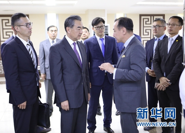 8月25日,在蒙古國(guó)首都烏蘭巴托,中國(guó)國(guó)務(wù)委員兼外交部長(zhǎng)王毅(前中)在蒙古國(guó)外長(zhǎng)朝格特巴特爾(前右)的陪同下專程來(lái)到烏蘭巴托成吉思汗國(guó)際機(jī)場(chǎng)考察“一帶一路”快速通道并現(xiàn)場(chǎng)了解情況。 新華社記者阿斯鋼攝