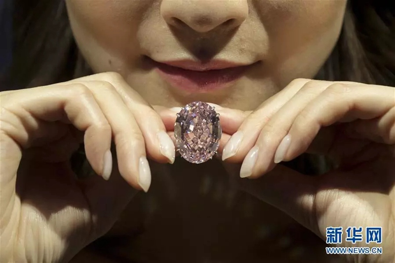 在中國(guó)香港蘇富比拍賣(mài)行,模特展示“粉紅之星”鉆石。新華社/歐新