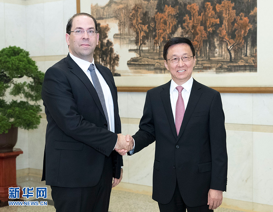 9月5日,中共中央政治局常委、國(guó)務(wù)院副總理韓正在北京釣魚臺(tái)國(guó)賓館會(huì)見突尼斯總理沙赫德。 新華社記者 王曄 攝