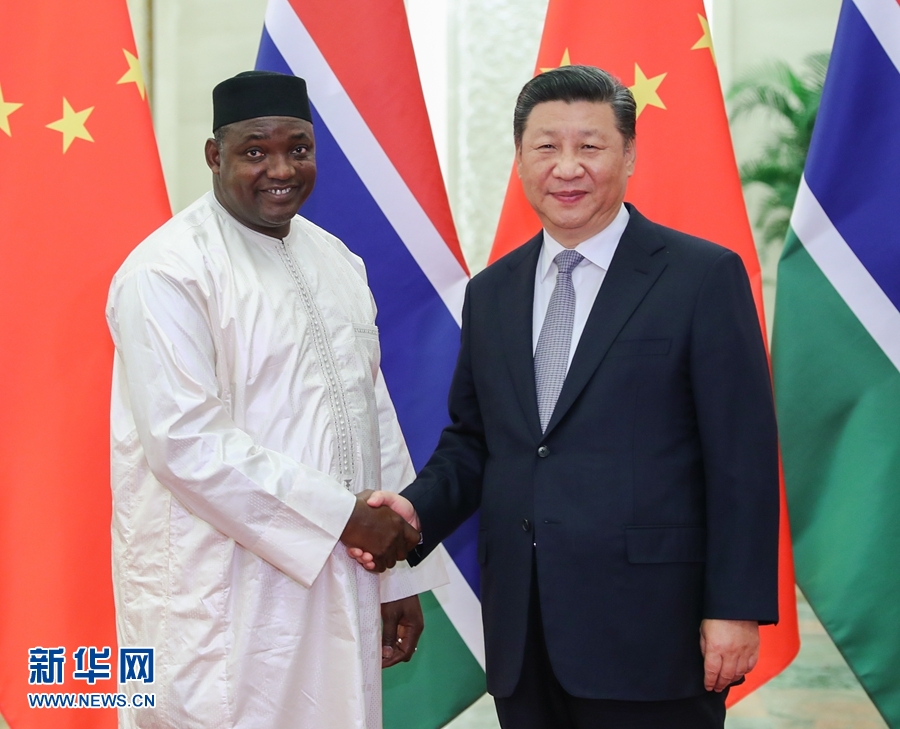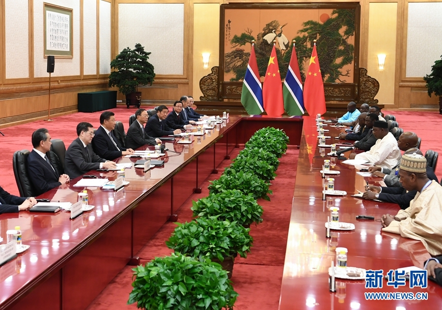 習(xí)近平歡迎岡比亞總統(tǒng)首次出席中非合作論壇會議,指出這對中岡關(guān)系、中非關(guān)系、論壇建設(shè)均具有重要意義。習(xí)近平強(qiáng)調(diào),中岡復(fù)交2年多來,雙方友好合作全面、順利推進(jìn),雙邊關(guān)系發(fā)展得很好、很快,中方對兩國關(guān)系發(fā)展取得的成果感到滿意。中方贊賞總統(tǒng)先生和岡比亞政府堅(jiān)持一個(gè)中國原則,愿同岡方繼續(xù)把握好兩國關(guān)系的大方向,不斷增進(jìn)政治互信,繼續(xù)在涉及彼此核心利益和重大關(guān)切問題上相互堅(jiān)定支持。中方支持岡比亞政府“建設(shè)新岡比亞”的努力,愿加強(qiáng)務(wù)實(shí)合作,擴(kuò)大人文交流。中方支持岡方加強(qiáng)和平安全能力建設(shè)。