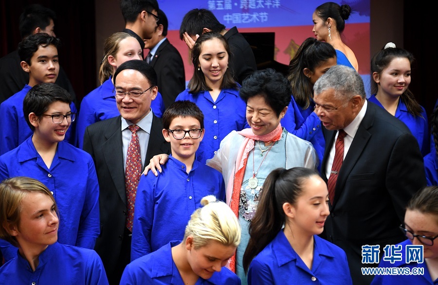 9月7日,在美國(guó)舊金山舉行的第五屆“跨越太平洋——中國(guó)藝術(shù)節(jié)”開(kāi)幕式上,皮德蒙特東灣兒童合唱團(tuán)成員與來(lái)賓合影。第五屆“跨越太平洋——中國(guó)藝術(shù)節(jié)”開(kāi)幕式7日在中國(guó)駐舊金山總領(lǐng)事館舉行。美國(guó)民間友好團(tuán)體、藝術(shù)界人士等230多人出席。 新華社記者吳曉凌攝