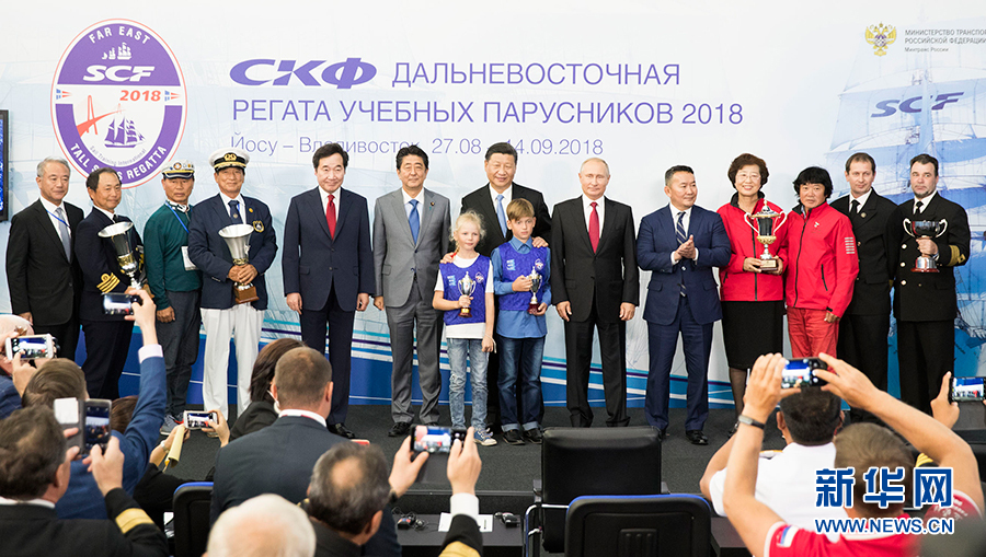 9月12日,第四屆東方經(jīng)濟(jì)論壇全會(huì)在符拉迪沃斯托克舉行。中國國家主席習(xí)近平、俄羅斯總統(tǒng)普京、蒙古國總統(tǒng)巴特圖勒嘎、日本首相安倍晉三、韓國總理李洛淵等出席。這是全會(huì)后,與會(huì)各國領(lǐng)導(dǎo)人共同出席第三屆“遠(yuǎn)東杯”國際帆船拉力賽第一賽段頒獎(jiǎng)儀式。 新華社記者黃敬文攝