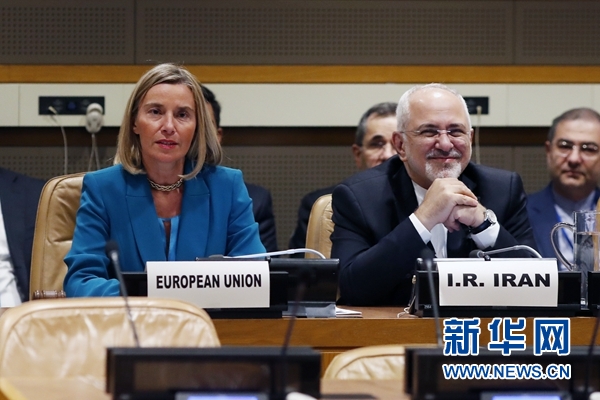 9月24日,在位于紐約的聯(lián)合國總部,歐盟外交和安全政策高級代表莫蓋里尼(前排左)同伊朗外長扎里夫出席伊朗核問題外長會。新華社記者李木子攝