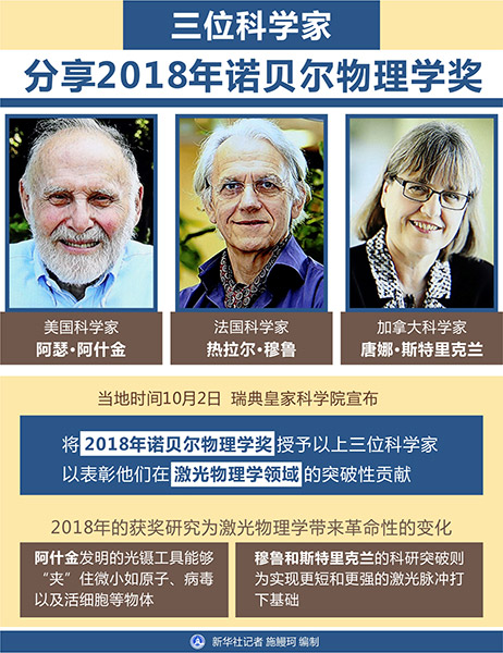 圖表:三位科學家分享2018年諾貝爾物理學獎 新華社記者 施鰻珂 編制