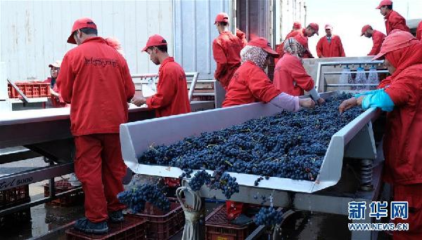 10月1日,在摩洛哥小鎮(zhèn)魯馬尼,紅農(nóng)場酒莊的工作人員對收獲的葡萄進行清洗加工。 據(jù)紅農(nóng)場總經(jīng)理馬蒙·薩耶介紹,該酒莊正在擴大產(chǎn)能,希望通過參加首屆中國國際進口博覽會,將摩洛哥葡萄酒引進中國市場。首屆中國國際進口博覽會將于11月5日至10日在上海舉行。目前已有130多個國家和地區(qū)的2800多家企業(yè)確認參展。 新華社記者陳斌杰攝