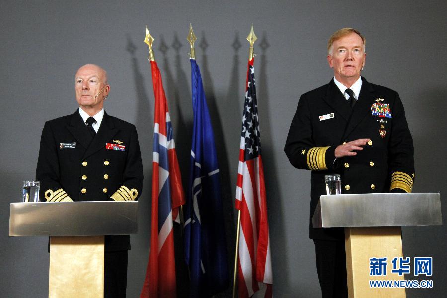 10月25日,在挪威首都奧斯陸,挪威國防司令、海軍上將哈康·布倫-漢森(左)和美國海軍上將詹姆斯·福戈介紹軍演情況。 當日,北大西洋公約組織(北約)開始在挪威及其周邊地區(qū)舉行為期兩周的“三叉戟接點2018”聯(lián)合軍事演習(xí)。這是北約自冷戰(zhàn)結(jié)束以來規(guī)模最大的一次聯(lián)合軍演。 新華社記者 梁有昶 攝