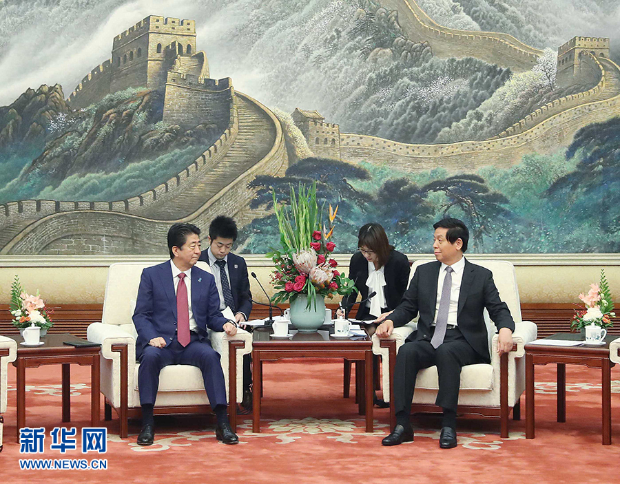 10月26日,全國人大常委會委員長栗戰(zhàn)書在北京人民大會堂會見日本首相安倍晉三。 新華社記者劉衛(wèi)兵攝
