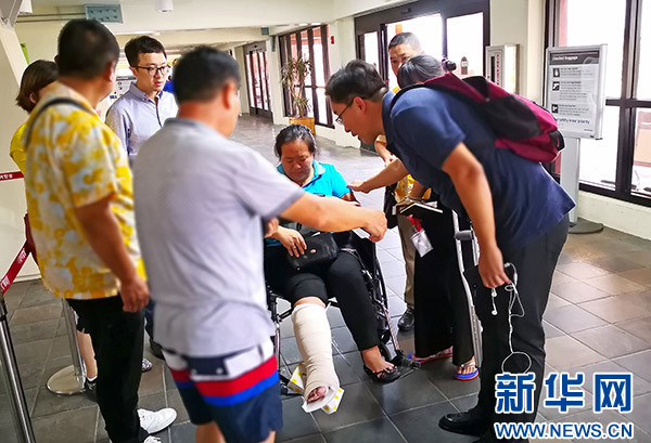 在機場等候的中國乘客秩序井然,許多人舉著國旗合影,非常興奮。一位在塞班開店的王女士腳部骨折,因當?shù)蒯t(yī)療條件有限,她向領館尋求幫助,經(jīng)領館協(xié)調(diào),也順利搭上川航飛機回國。