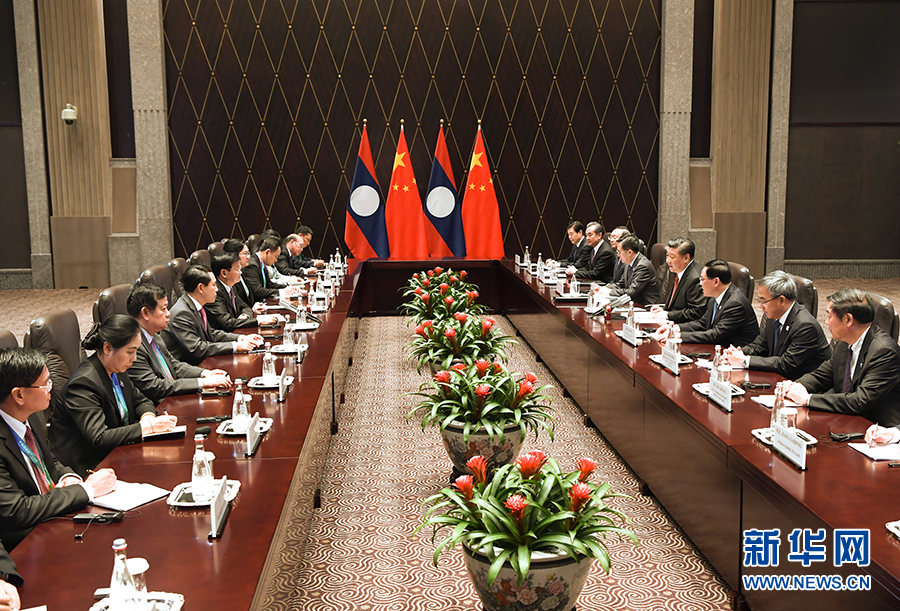 11月4日,國(guó)家主席習(xí)近平在上海會(huì)見(jiàn)老撾總理通倫。 新華社記者 丁海濤 攝