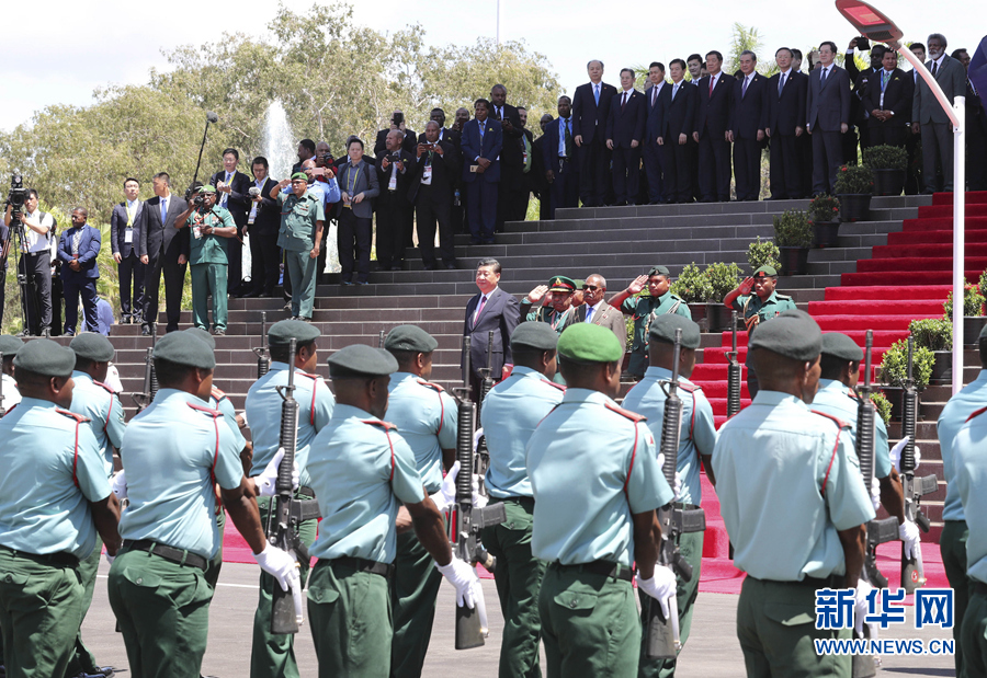 當?shù)貢r間上午10時30分許,習近平乘車抵達議會大廈,受到達達埃熱情迎接。兩國領(lǐng)導(dǎo)人登上檢閱臺。軍樂隊奏中巴新兩國國歌?,F(xiàn)場鳴21響禮炮。習近平在達達埃陪同下檢閱儀仗隊。檢閱畢,習近平同巴新方主要官員握手,達達埃同中方陪同人員握手。兩國領(lǐng)導(dǎo)人共同前往議會大廈會見廳,巴布亞新幾內(nèi)亞議長波馬特等在大廈外迎接并陪同會見。