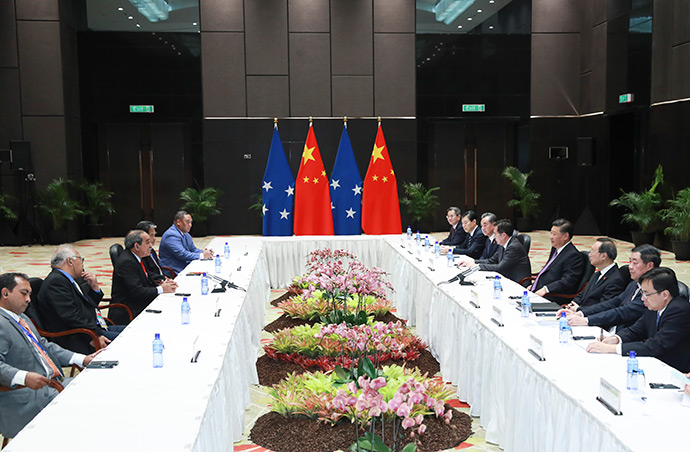 11月16日,國家主席習(xí)近平在莫爾茲比港分別會(huì)見建交太平洋島國領(lǐng)導(dǎo)人。這是習(xí)近平會(huì)見密克羅尼西亞聯(lián)邦總統(tǒng)克里斯琴。新華社記者 謝環(huán)馳 攝