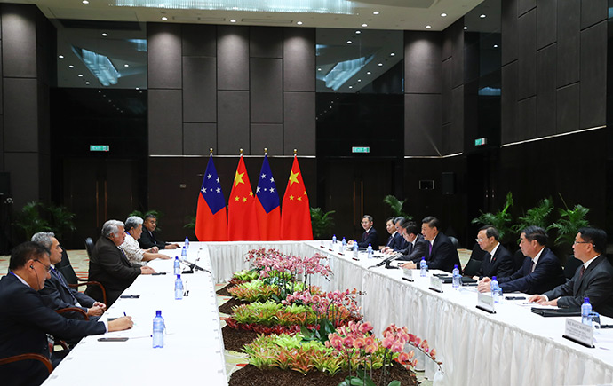 11月16日,國家主席習(xí)近平在莫爾茲比港分別會(huì)見建交太平洋島國領(lǐng)導(dǎo)人。這是習(xí)近平會(huì)見薩摩亞總理圖伊拉埃帕。新華社記者 謝環(huán)馳 攝
