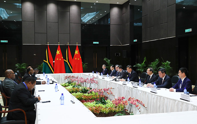 11月16日,國家主席習(xí)近平在莫爾茲比港分別會(huì)見建交太平洋島國領(lǐng)導(dǎo)人。這是習(xí)近平會(huì)見瓦努阿圖總理薩爾瓦伊。新華社記者 謝環(huán)馳 攝