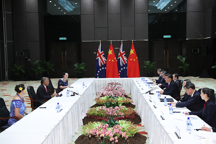 11月16日,國家主席習(xí)近平在莫爾茲比港同巴布亞新幾內(nèi)亞總理奧尼爾、密克羅尼西亞聯(lián)邦總統(tǒng)克里斯琴、薩摩亞總理圖伊拉埃帕、瓦努阿圖總理薩爾瓦伊、庫克群島總理普納、湯加首相波希瓦、紐??偫硭冉ń惶窖髰u國領(lǐng)導(dǎo)人以及斐濟(jì)政府代表、國防部長昆布安博拉舉行集體會(huì)晤。習(xí)近平主持會(huì)晤并發(fā)表主旨講話。新華社記者 謝環(huán)馳 攝