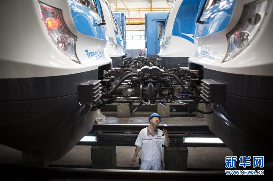 2017年4月11日,在位于阿根廷首都布宜諾斯艾利斯以南的利亞瓦略爾,中方技術(shù)人員檢查為羅卡線城際鐵路提供的列車。近年來,在阿根廷,中車制造的各種軌距、各種制式、各種型號的鐵路機(jī)車、動車組、客車、貨車和地鐵列車密集交付。新華社發(fā)(馬丁·薩巴拉 攝)