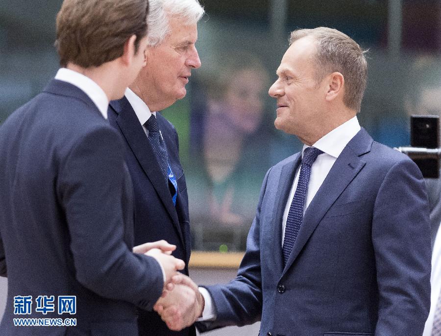 11月25日,在比利時(shí)布魯塞爾的歐盟特別峰會(huì)會(huì)場(chǎng),歐洲理事會(huì)主席圖斯克(右)與歐盟“脫歐”談判首席代表米歇爾·巴尼耶(中)握手。 新華社記者葉平凡攝