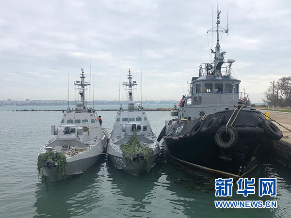 這是11月26日拍攝的被俄方扣留的烏克蘭海軍3艘船只。 新華社/衛(wèi)星社