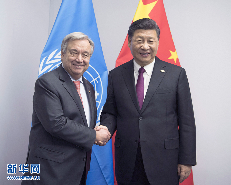 當(dāng)?shù)貢r(shí)間11月30日,國(guó)家主席習(xí)近平在布宜諾斯艾利斯會(huì)見聯(lián)合國(guó)秘書長(zhǎng)古特雷斯。 新華社記者 李學(xué)仁 攝