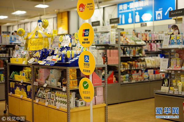 7月14日,日本大阪的某商場,幾乎每一個(gè)專柜前都立有中國移動(dòng)支付的提示牌。(圖片來源:視覺中國)