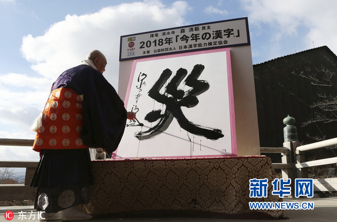 當(dāng)?shù)貢r(shí)間2018年12月12日,日本京都,京都清水寺住持森清范在巨幅和紙上揮毫寫下了今年的年度漢字——“災(zāi)”。(圖片來(lái)源:東方IC)