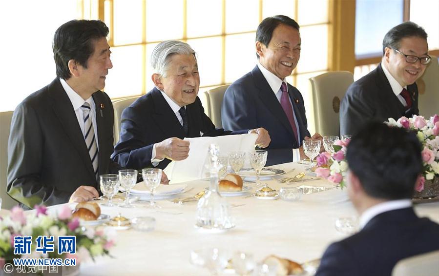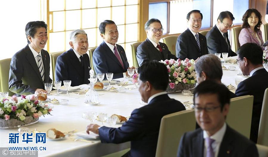 當(dāng)?shù)貢r間2018年12月17日,日本東京,日本明仁天皇在皇宮與日本首相安倍晉三領(lǐng)導(dǎo)的政府高官共進(jìn)年終午餐。(圖片來源:視覺中國)