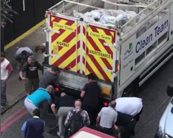 7月26日,在英國(guó)倫敦,老人被困垃圾車下。15名熱心民眾合力抬起垃圾車,幫助老人脫險(xiǎn)。