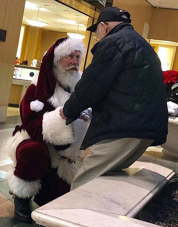 12月9日,美國(guó)特拉華州,一位裝扮成“圣誕老人”的男子向一位路過(guò)的二戰(zhàn)老兵屈膝致敬。