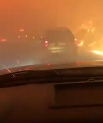 美國(guó)加州煙霧鎖城,路兩側(cè)火光沖天