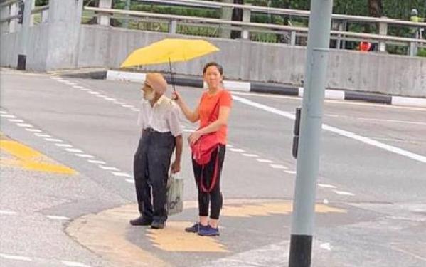 12月8日,新加坡的一個(gè)交通路口,傾盆大雨中,一名中國(guó)女性為一名印度錫克教徒打扮的老者撐傘。