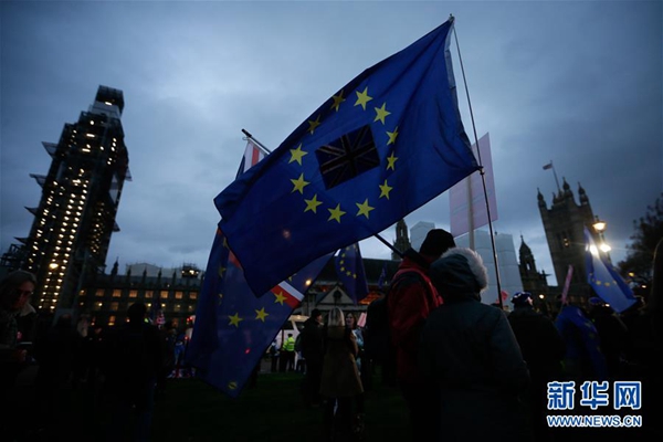 1月15日,在英國(guó)倫敦,反對(duì)英國(guó)“脫歐”示威者在議會(huì)大廈外參加集會(huì)。新華社發(fā)(蒂姆·愛爾蘭攝)